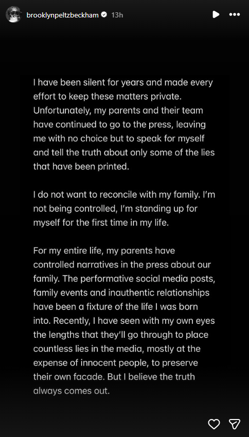 Part of Brooklyn Beckham's Statement via Instagram.Some of the statement reads, "I've been silent for many years and have made every effort to keep these matters private".