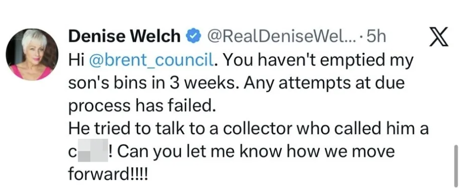 Loose Woman star Denise Welch took to X to take matters into her own hands after her son's bin wasn't collected.