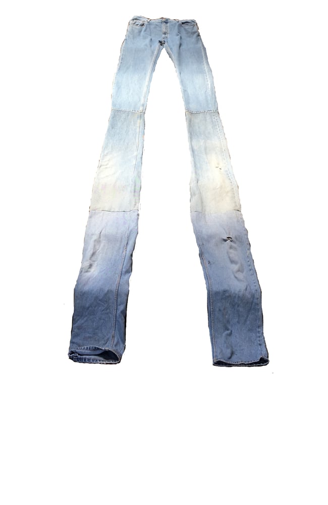 They are selling a pair of nine-foot 'extendo' jeans for $500. The jean are one pair of 90s dad jeans with two legs of jeans sewn onto the ends.