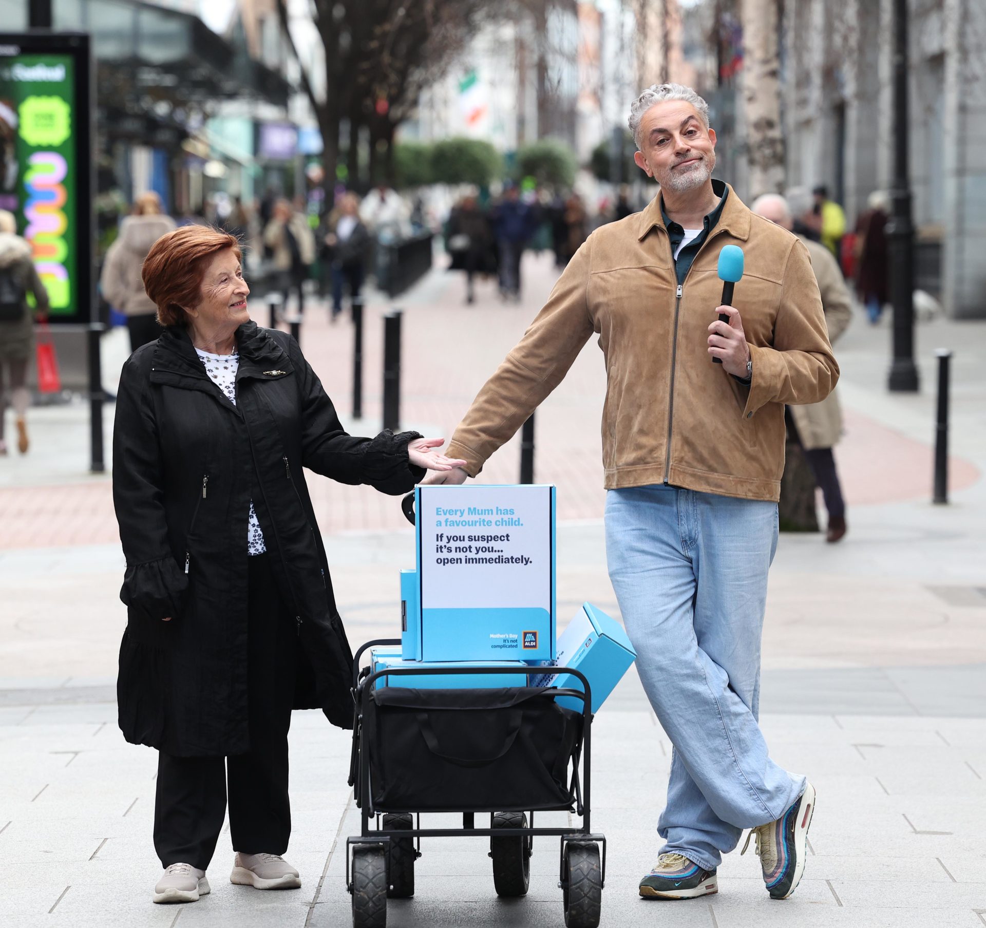 Today, ALDI Ireland is launching the search for Ireland’s Favourite Child. To begin the hunt, Baz & Nancy Ashmawy hit the streets of Dublin City this morning, bringing excitement and joy as part of the celebrations. Passersby were invited to call their mam on the spot and tell her just “how much they mean to them.”